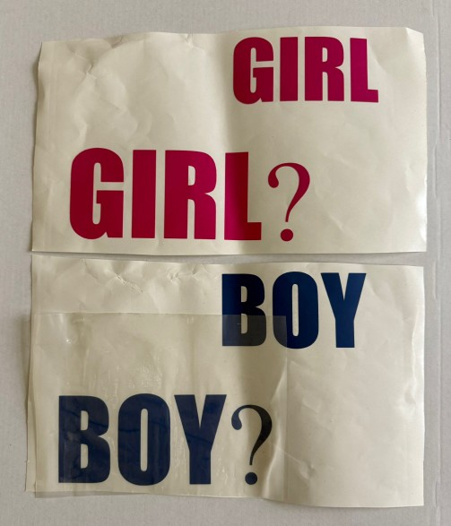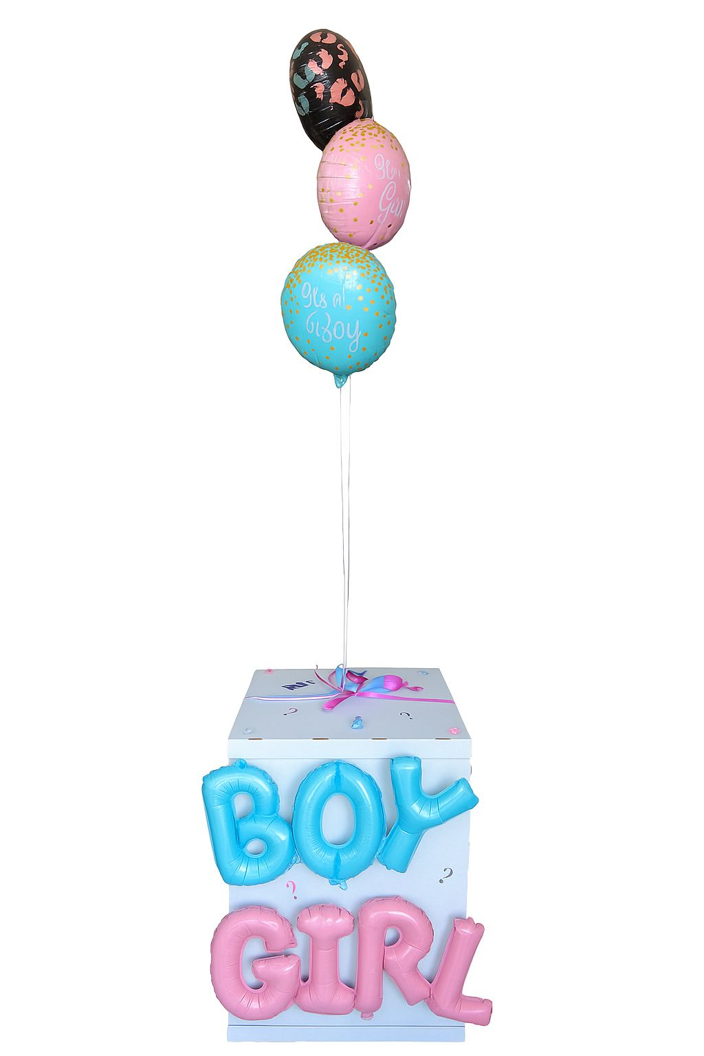 -2 baloane folie BOY / GIRL ce se vor umfla cu aer pentru a le lipi pe cutie;
