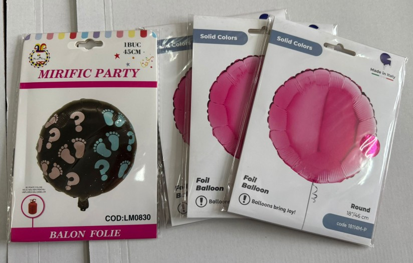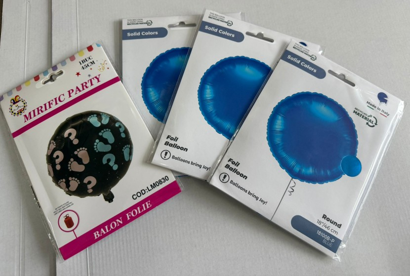 -4 baloane folie cu heliu: un balon tipic pentru dezvaluire si 3 baloane folie roz sau albastre umflate cu heliu care le veti pune in cutie;