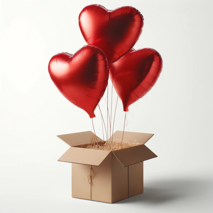 • 3 baloane de folie în formă de inimă, roșii, cu dimensiunea de 45 cm (aproximativ 40 cm după umflare), umflate cu heliu și legate cu rafie.