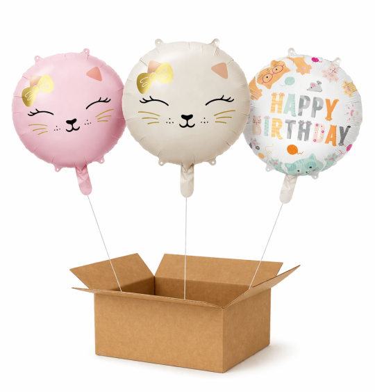 - Trei baoane folie rotunde cu tematica pisici, unul are Happy Birthday ca si mesaj si pisici pe el, cu dimensiunea de 45 cm, umflate cu heliu și legate cu rafie.