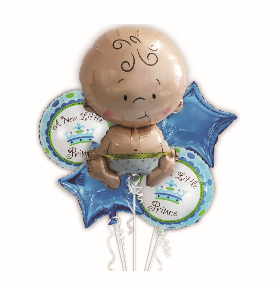 Setul contine 5 baloane folie, unul in forma de bebelus, 2 baloane folie stea albastra si 2 baloane rotunde cu mesajul New Little Prince.