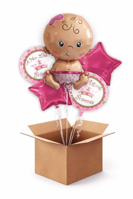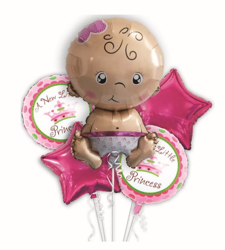 Setul contine 5 baloane folie, unul in forma de bebelus, 2 baloane folie stea albastra si 2 baloane rotunde cu mesajul New Little Princess.