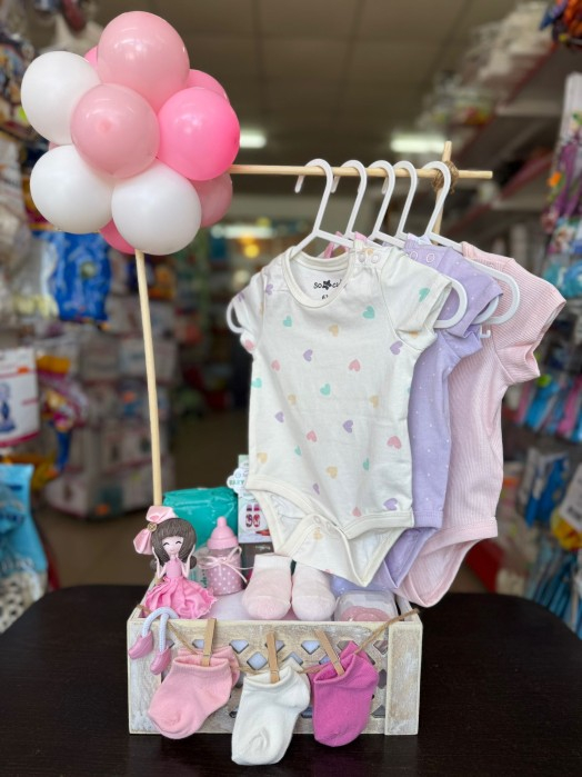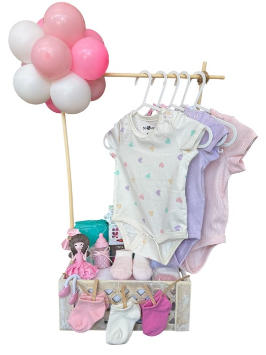 Un coșuleț cadou delicat și plin de lucruri utile pentru o mică prințesă. Produsele sunt atent selectate și aranjate într-un suport decorativ, însoțit de baloane în nuanțe pastel de roz și alb.